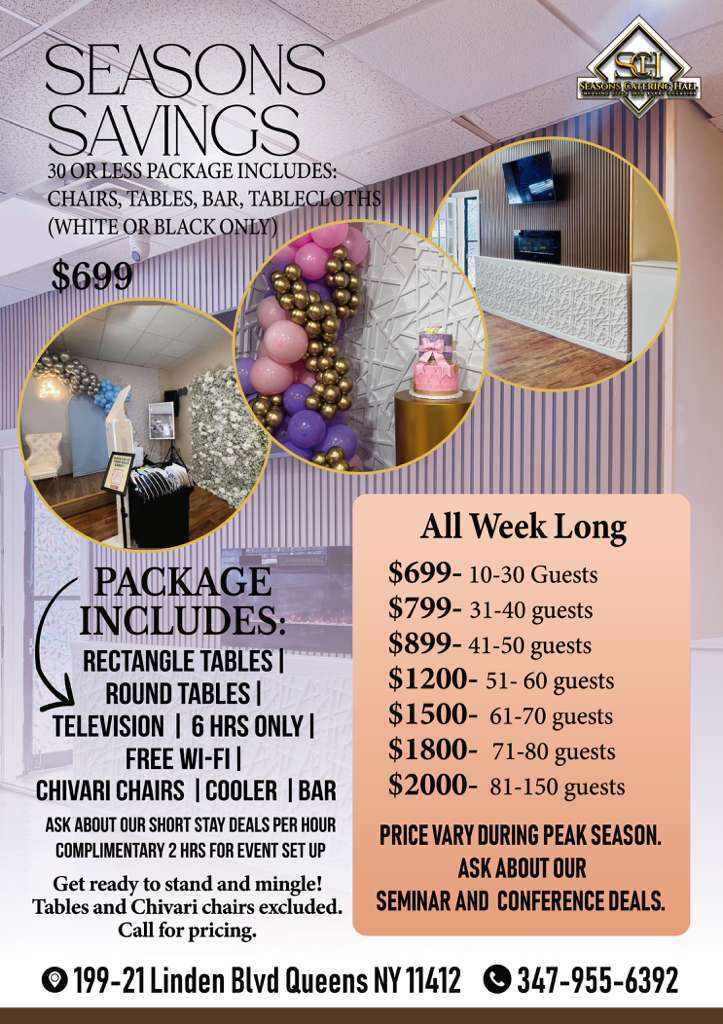 - Includes Tables, Chairs, Tablecloths ( White or Black )